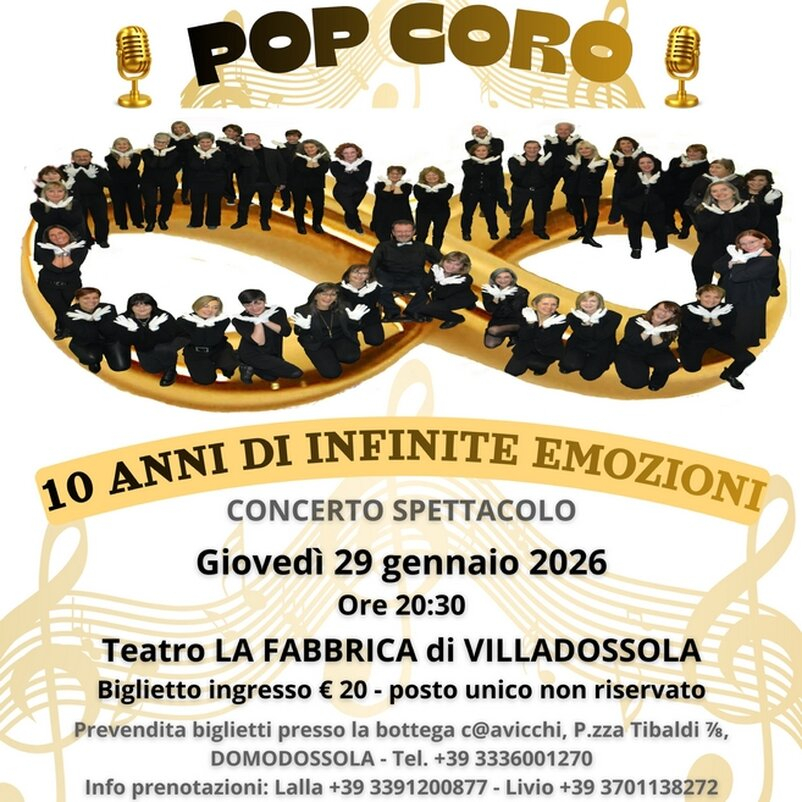 L'Associazione Famiglie E Fanciulli Down presenta il concerto-spettacolo "Pop coro - 10 anni di infinite emozioni" al Teatro "La Fabbrica" di Villadossola, giovedì 29 gennaio 2026, ore 20:30.