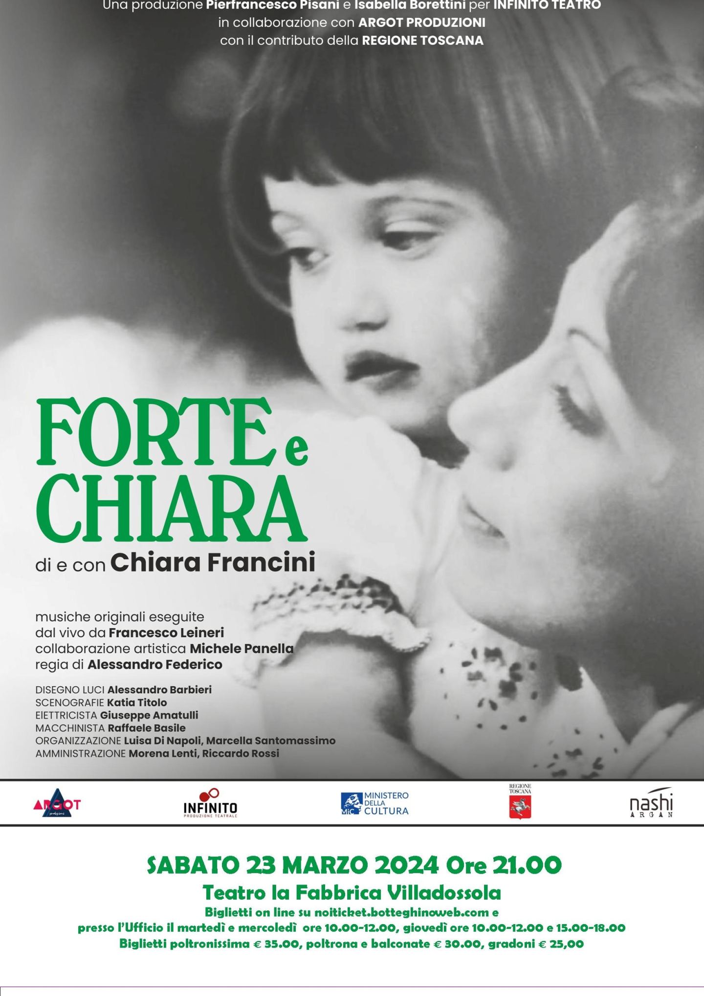 Forte e Chiara è un memoir, un racconto umano vivo e rivoluzionario. Un one woman show in cui Chiara Francini ripercorre la sua vita, unica eppure così simile a quella di tanti altri. Con il sarcasmo e l’ironia tagliente che la contraddistinguono, l’attrice si racconta attraverso la musica, vicende personali e pubbliche, dicendo sempre la verità, senza far sconti a nessuno, in primis a sé stessa.