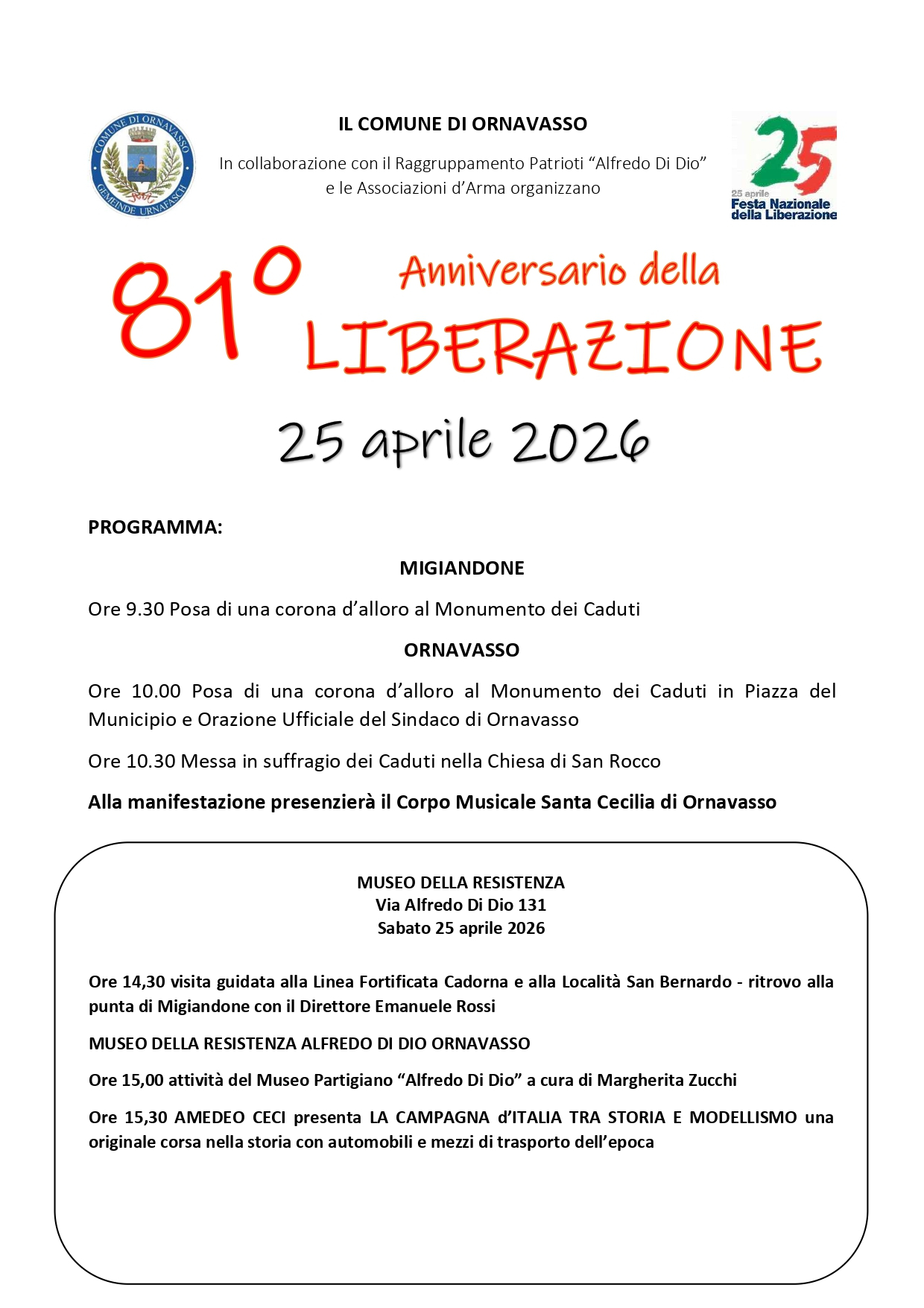Sabato 25 aprile 2026, in occasione dell'81° Anniversario della Liberazione, si terrà presso il Museo della Resistenza, alle 15:30 la presentazione di Amedeo Ceci "La Campagna d’Italia tra storia e modellismo", una originale corsa nella storia con automobili e mezzi di trasporto dell’epoca.